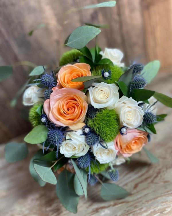 Bouquet Mariée perlé Rose Saumon et Éryngium