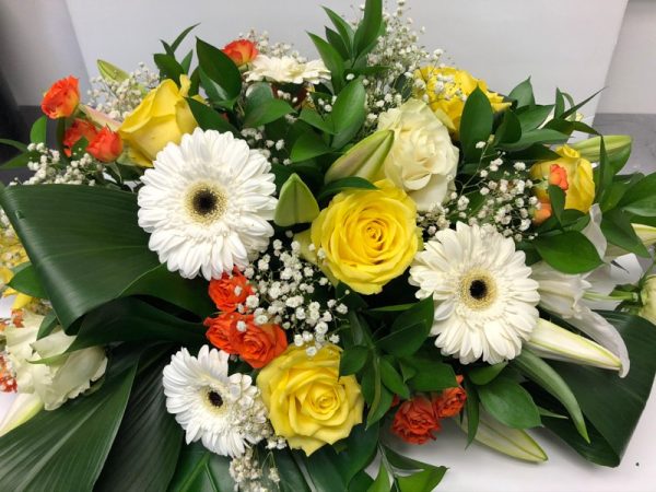 This beautiful coffin cushion is presented with our flowers of the moment.
