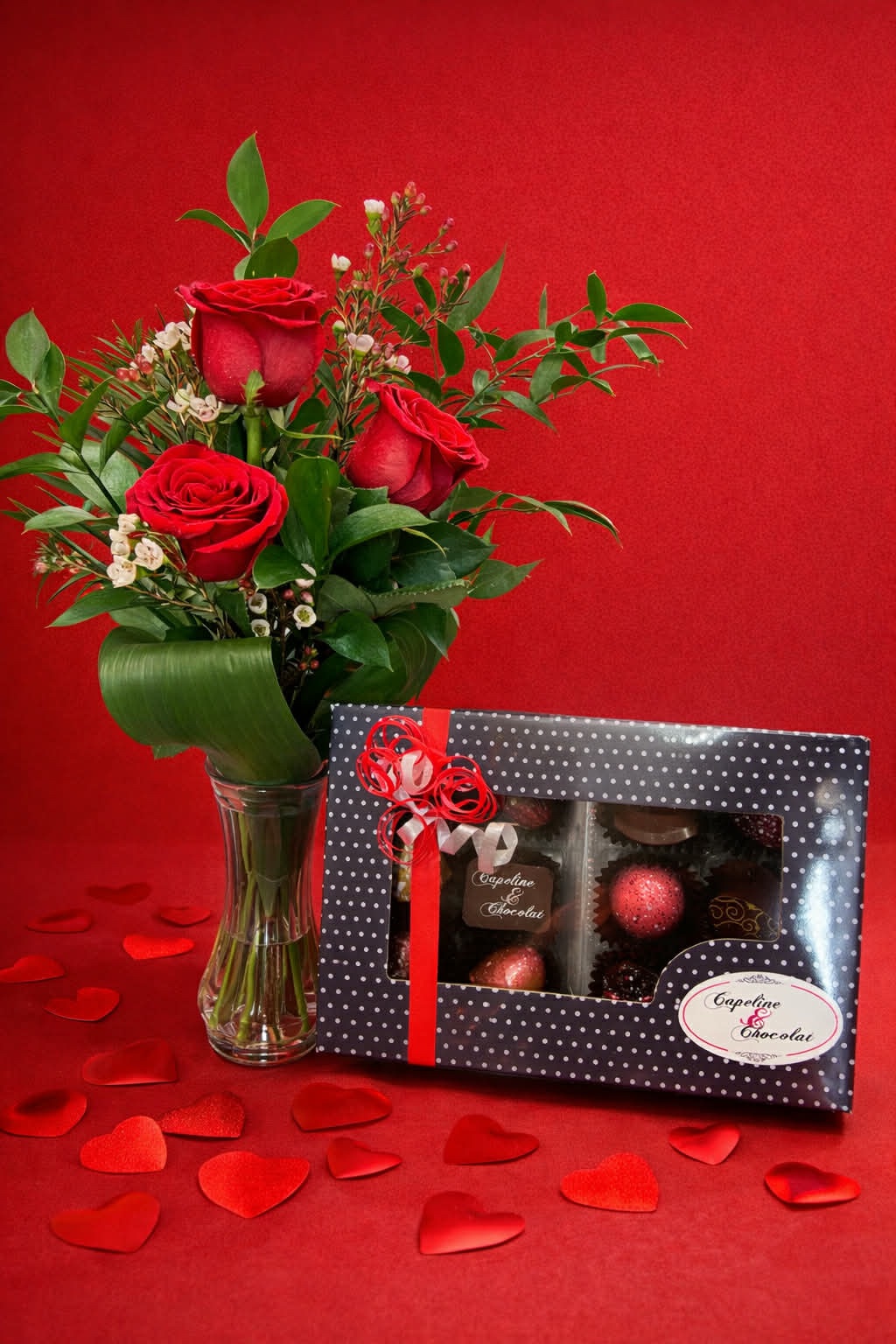 Le bouquet est accompagné d’une boîte de chocolats en collaboration avec Capeline & Chocolats de Bedford, une chocolaterie locale reconnue pour la qualité de ses produits.